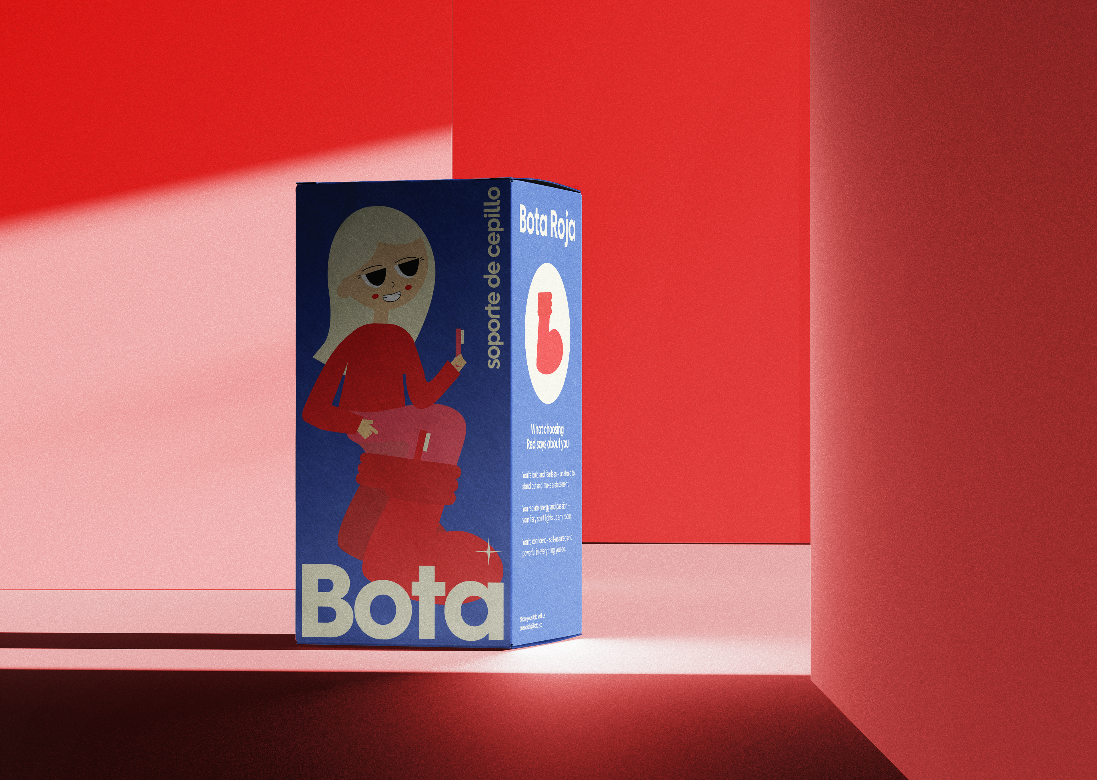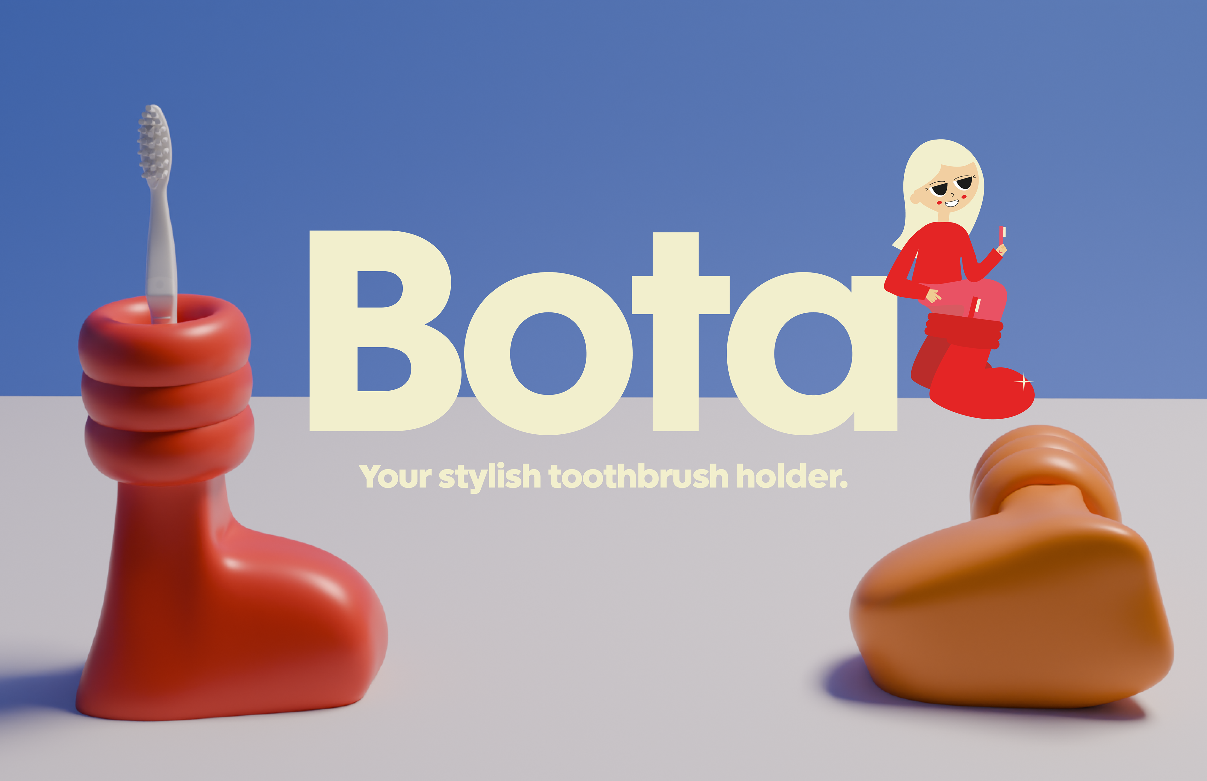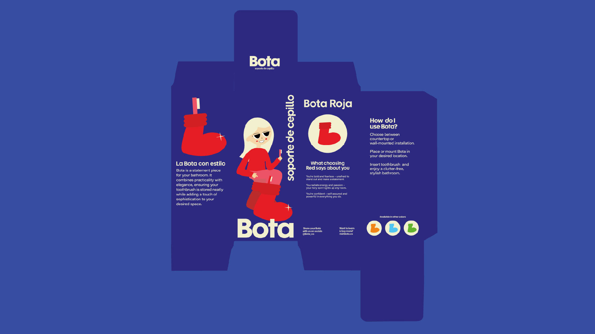 Bota is a statement piece for your toothbrush and bathroom. It combines practicality with elegance, ensuring your toothbrush is stored neatly while adding a touch of sophistication to your desired space. I crafted the form of the boot in RhinoCeros and had it 3D printed. I took on the art direction of crafting my own packaging box for the product.