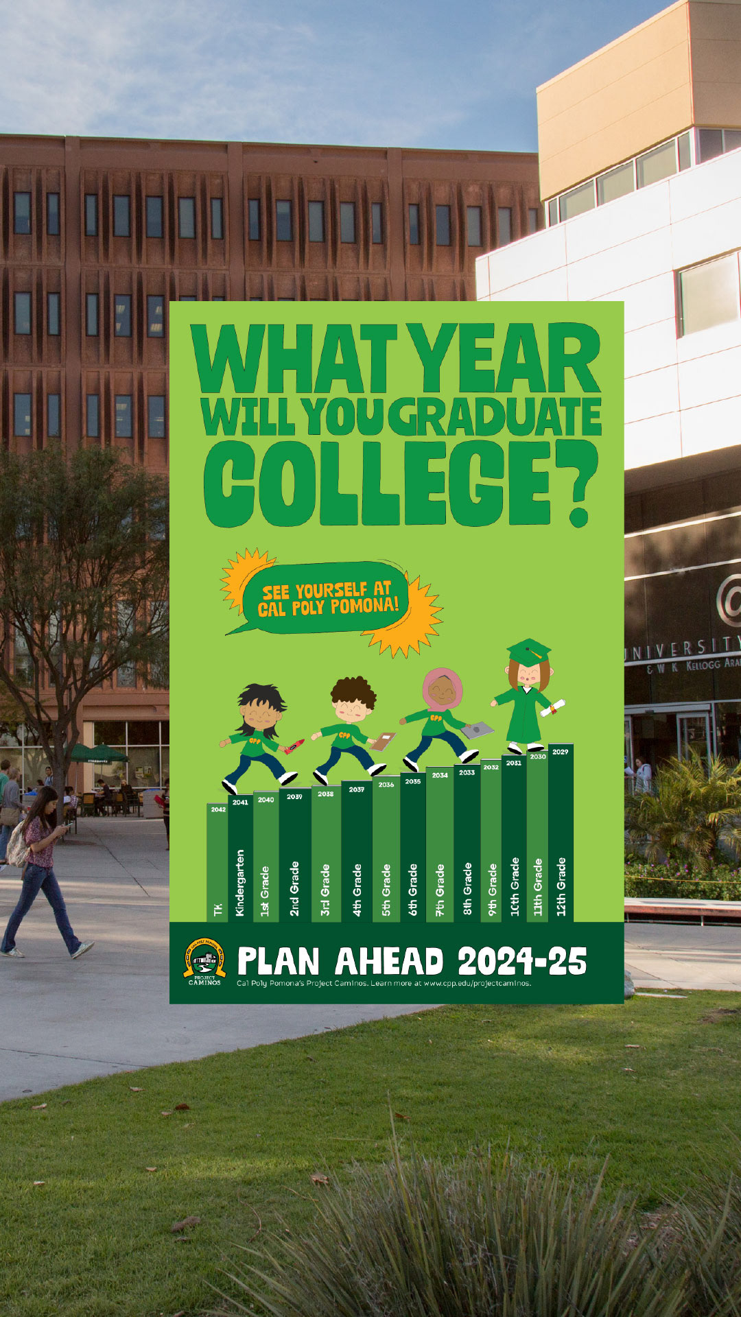Designed an informative poster illustrating future graduate years in university. They were distributed at Pomona and Chaffey Unified School District.